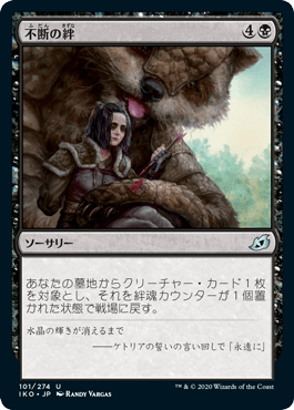 黒緑が墓地利用のリミテッドアーキタイプを担当するのはよくあることですが、《再来》《不断の絆》とシンプルな低レアリアニメイト呪文が2種あるのはかなり異例ですし、《永遠の頂点、ブロコス》は墓地から変容能力により何度でも蘇ります(自分はブロコスのこれを「ブロコスは不死なのではなく、ブロコスの死後に他の怪物が次のブロコスに『なる』」のだというネタばらしだと捉えているのですが、皆さんどうなんですかね?)。そして言わずと知れた《夢の巣のルールス》《深海の破滅、ジャイルーダ》も墓地に関係します。イコリアの元ネタは怪獣映画やパニック映画ですが、これは不死・フラッシュバック・降霊のように「一度死んでも(終わっても)終わりではない」ゴシックホラーなメカニズムを擁するイニストラードに近いのかもしれません。